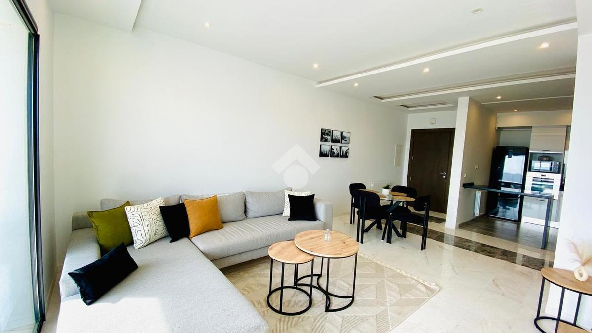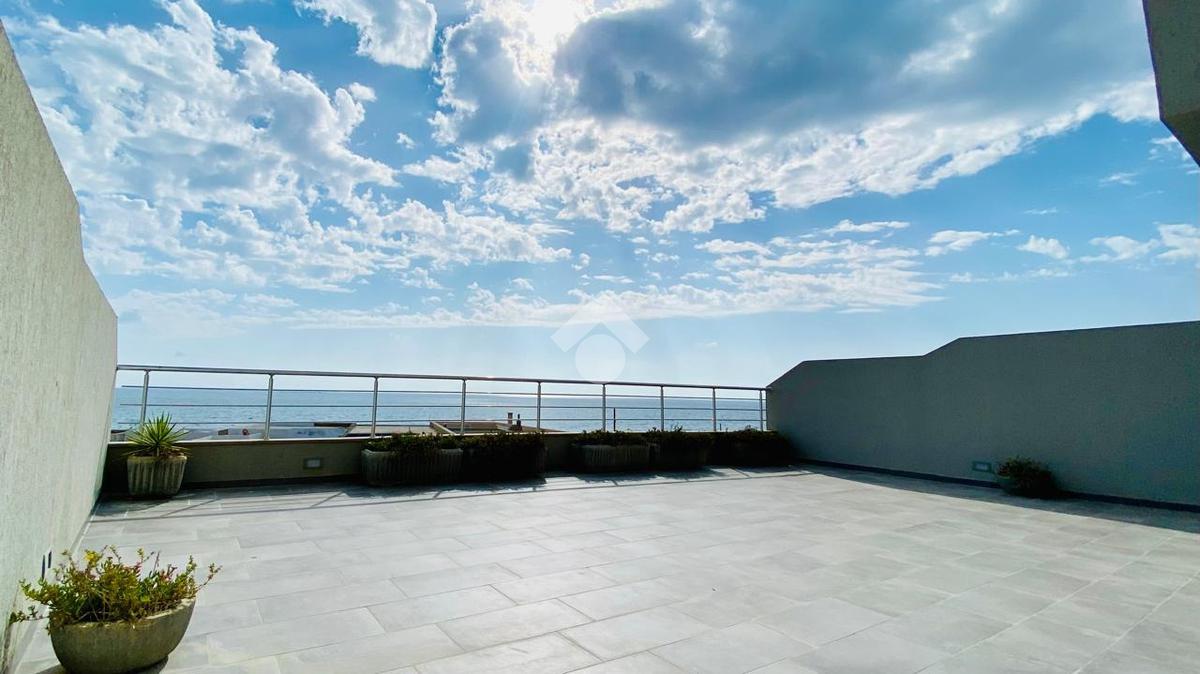L'entrée s'ouvre sur un salon lumineux avec des baies vitrées donnant sur une terrasse offrant une vue imprenable sur la mer.
